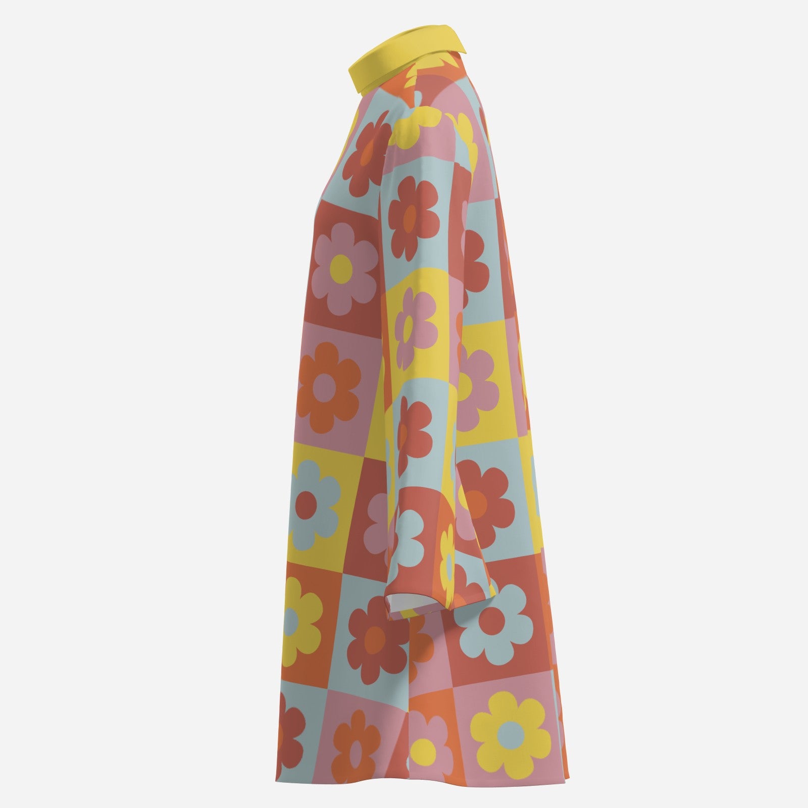 Embrace the free-spirited vibe of the late 60s and 70s with this retro bell sleeve dress featuring a striking multicolor floral Mary Quant-inspired print. This rare and unique dress combines a hippie boho flair with alternating color floral checkers, highlighted by a contrasting yellow turtleneck neckline. The relaxed tent-style bodice flows into a playful mini skirt, crafted from semi-sheer chiffon with a soft lining for comfort. Fully lined with a back zipper closure, it’s perfect for pairing with tall funky boots in white, yellow, pink, or chunky heels. Stand out and turn heads with this exclusive design by Trendy Hip Buys.