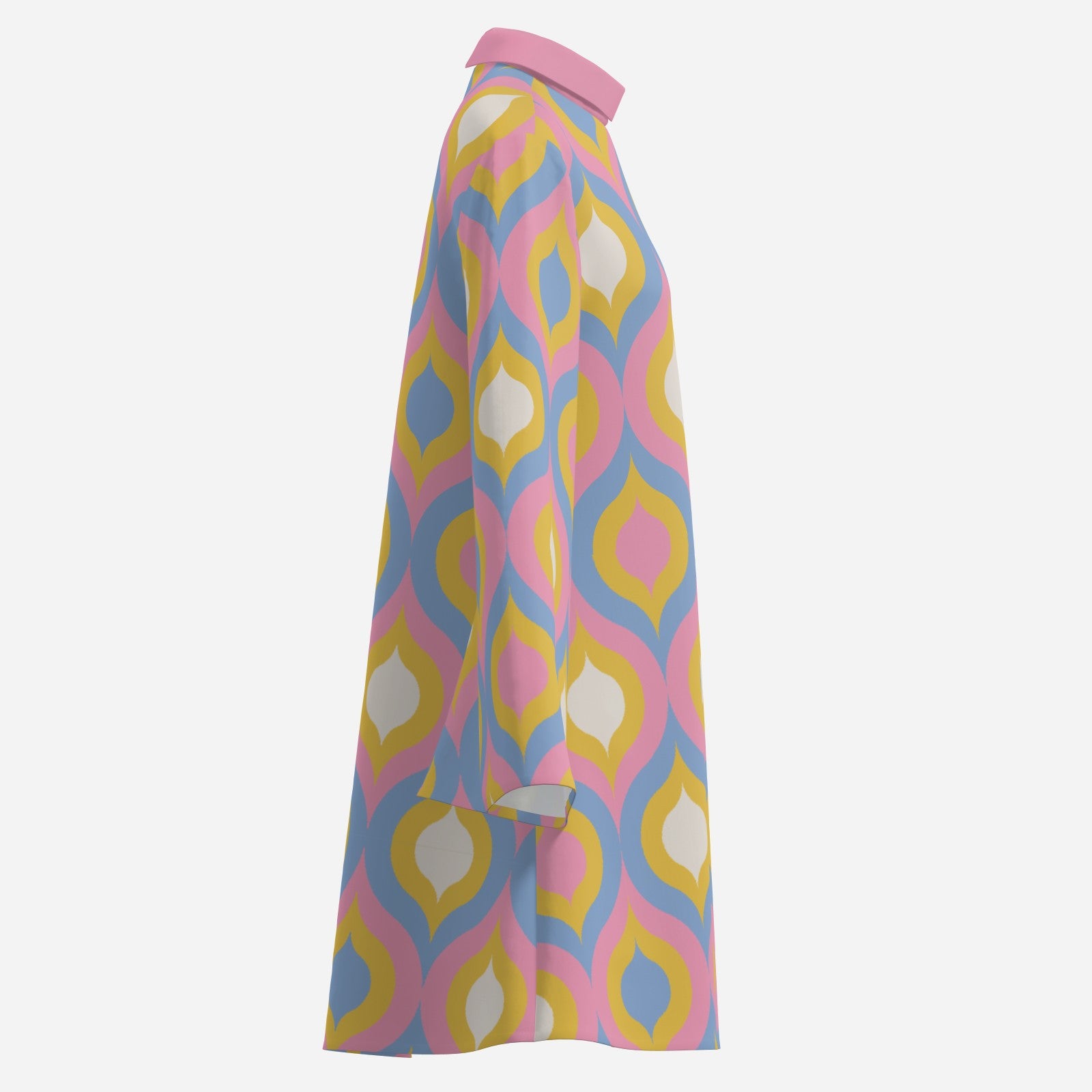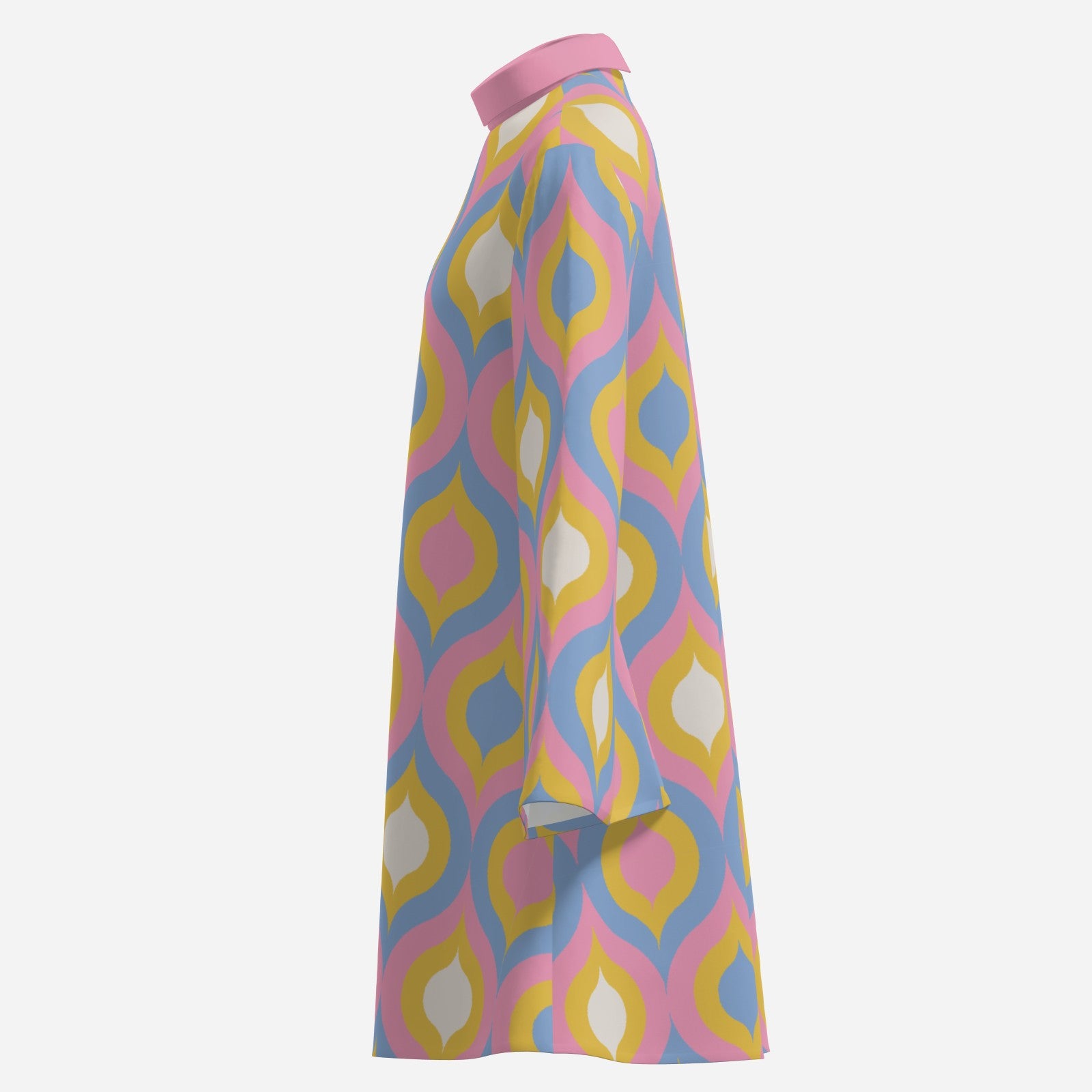 Make a bold retro entrance in this 70s Style Groovy Pink Disco Dress, designed to channel iconic mod and disco-era fashion. Featuring a pink turtleneck neckline, dramatic long bell sleeves, and a flattering tent-style bodice, this dress delivers maximum movement and vintage flair. The groovy geometric pattern in pink, blue, and yellow draws inspiration from classic 60s–70s mod prints, making it a true statement piece. Finished with a back zipper for easy wear, this mini dress pairs perfectly with tall white go-go boots for a head-turning retro look. Ideal for 70s theme parties, disco nights, festivals, or a fun night out. Designed exclusively by Trendy Hip Buys.