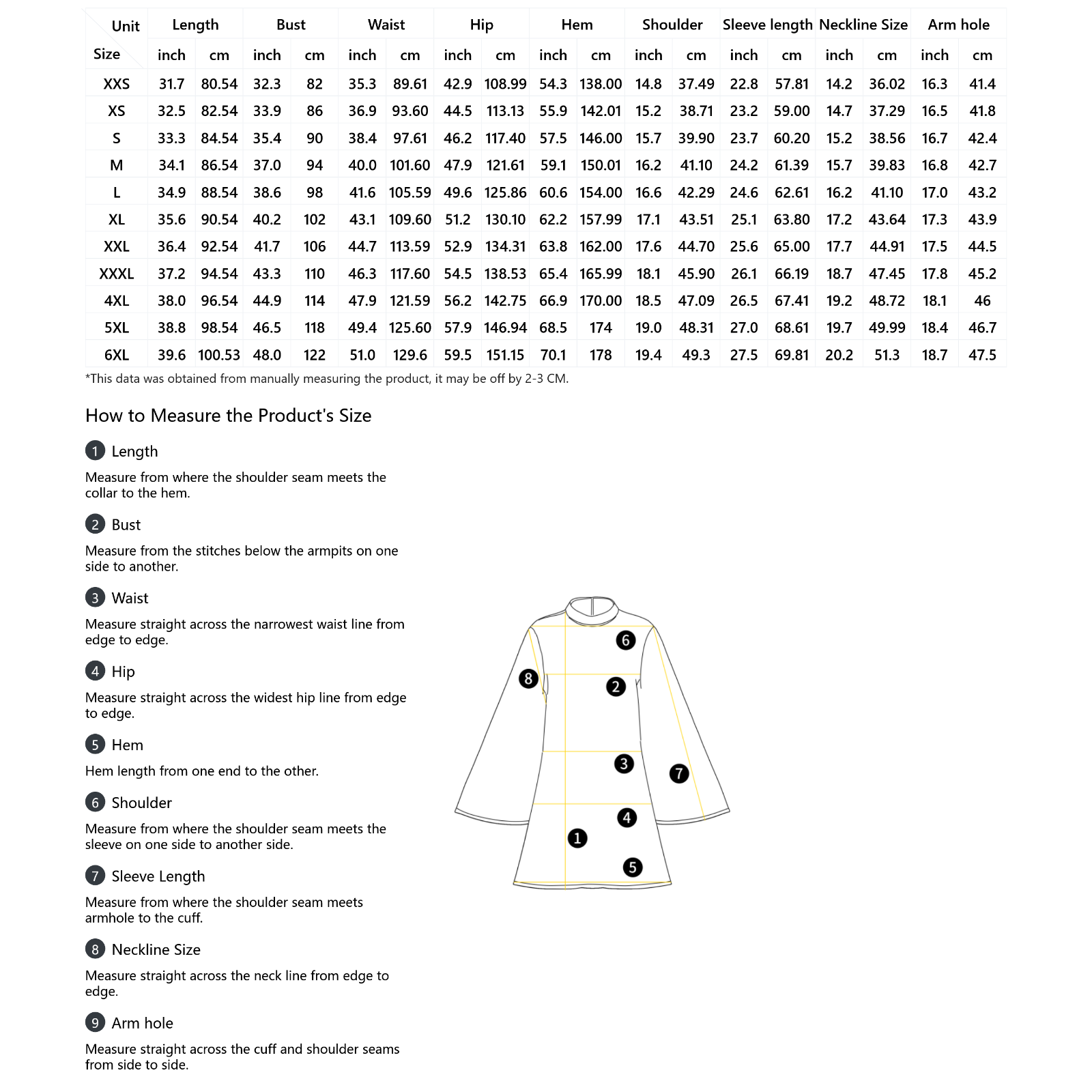 *The measurement data of this size is obtained by laying clothes flat. Due to different measurement methods, it is normal that the error is within 2-3cm.