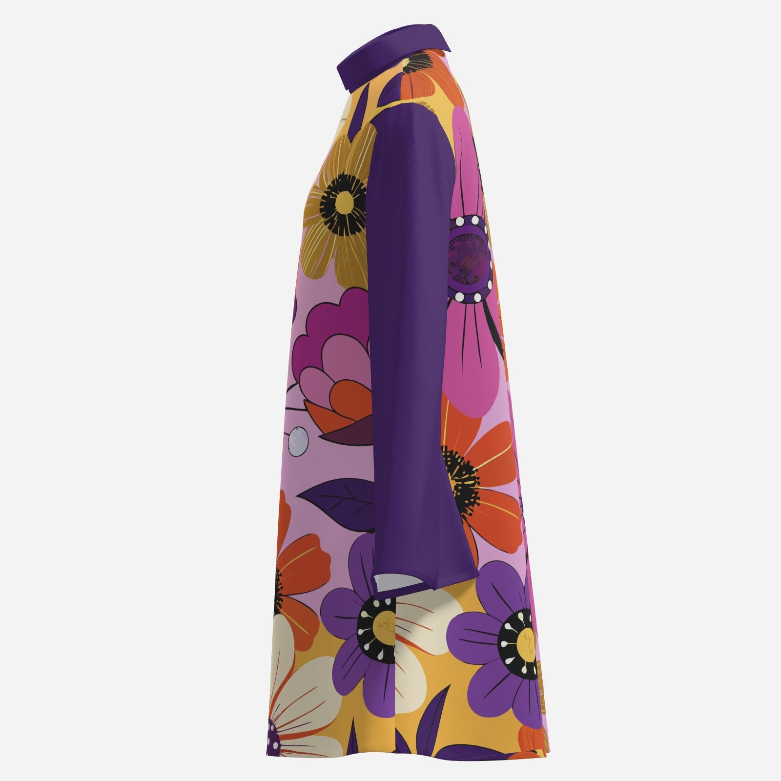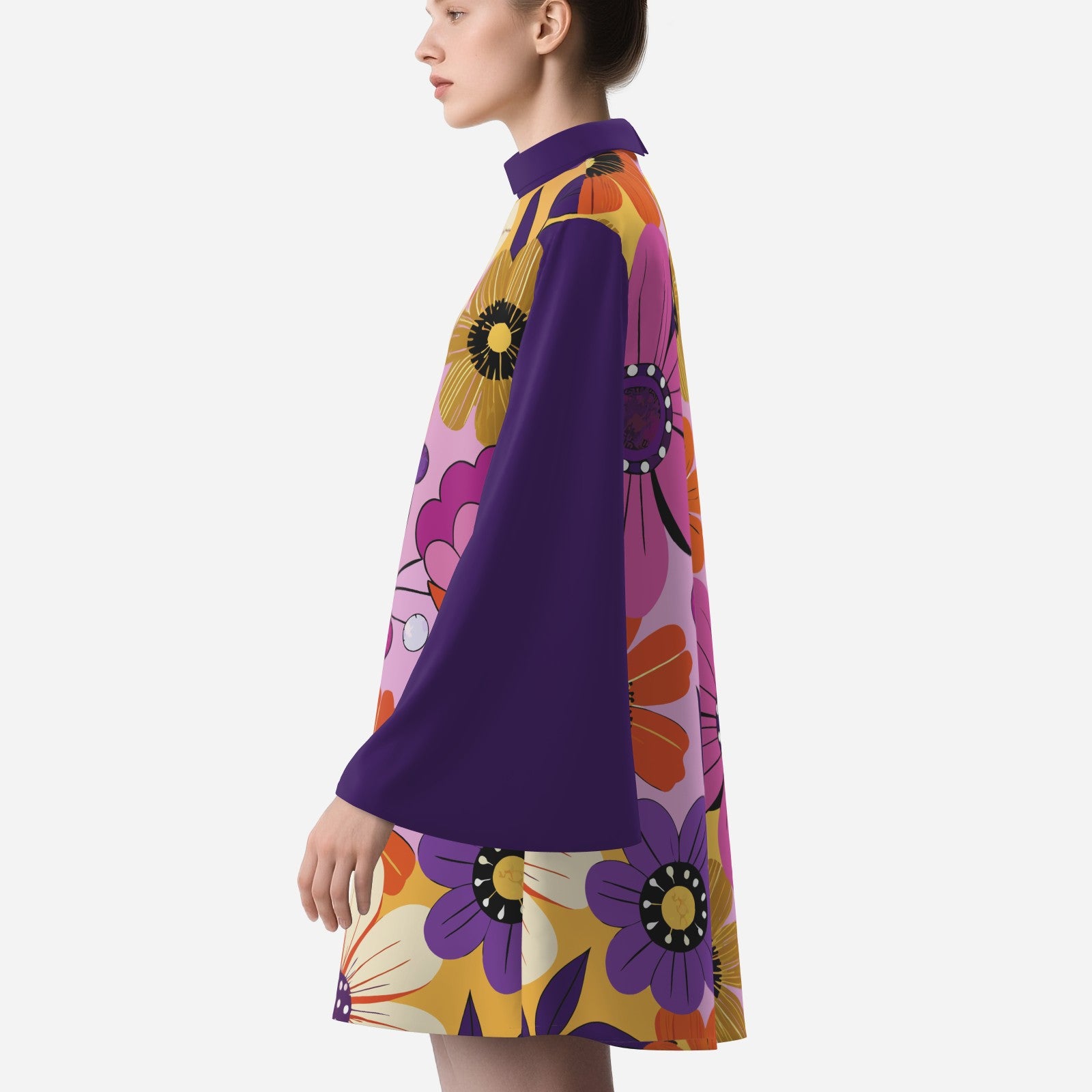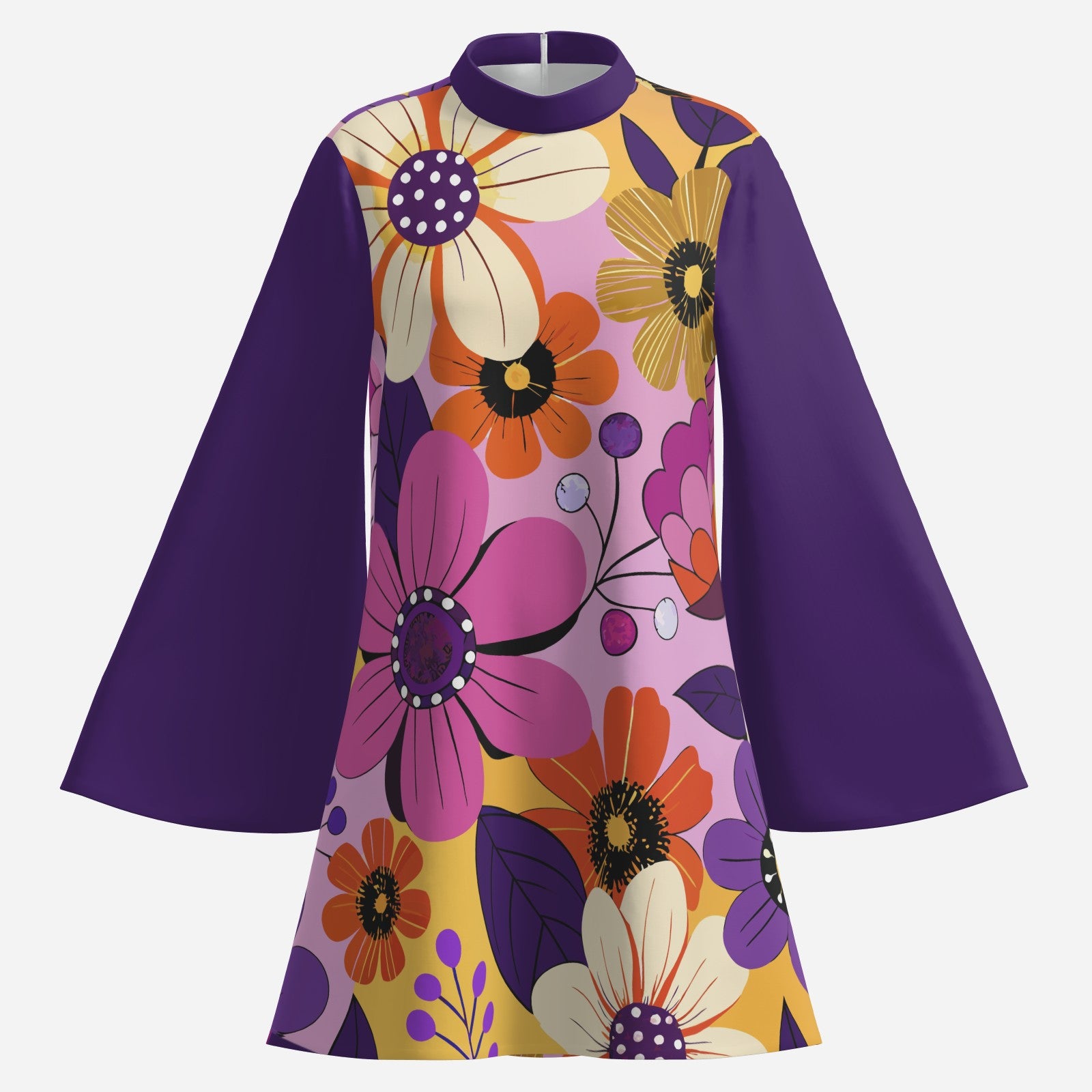 Capture the essence of the disco era with this stunning 70s style dress featuring a vibrant floral tent silhouette. The contrasting purple turtleneck neckline and dramatic bell sleeves add bold flair while delivering that iconic retro vibe. Crafted for effortless style and comfort, this dress is perfect for parties, festivals, or vintage fashion lovers looking to channel groovy 1970s energy with a modern twist.