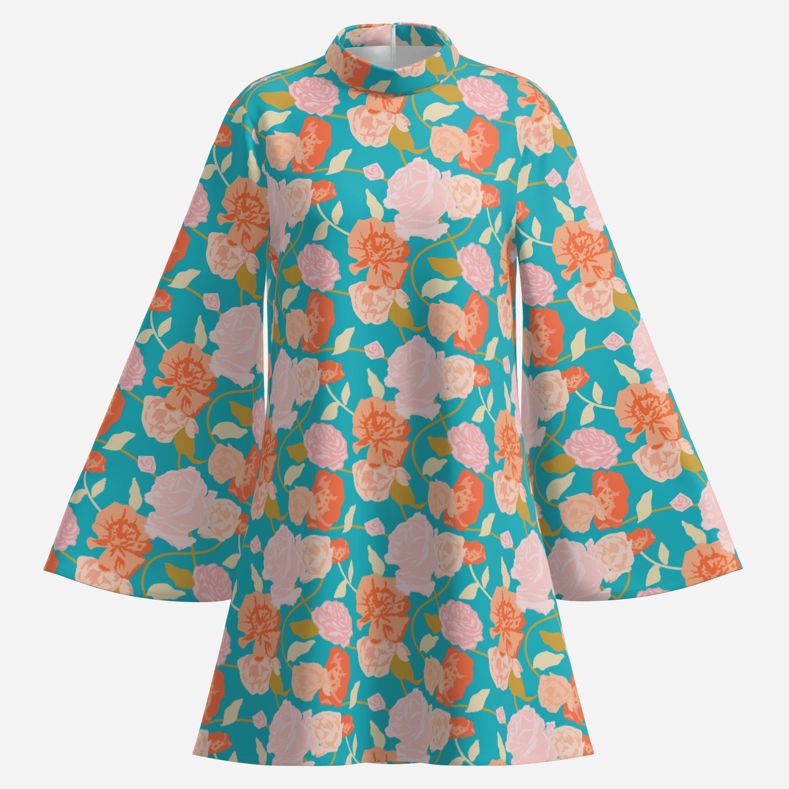 Capture the effortless elegance of the 1970s with this Retro Turquoise Floral Bell Sleeve Mini Dress. Designed with a romantic turquoise, red, and pink floral pattern, this vintage-inspired dress features dramatic bell sleeves, a classic turtleneck, and a flirty above-the-knee silhouette. Made from chiffon polyester and fully lined for comfort, this 70s-style mini dress is perfect with tall boots or chunky heels for a chic, bohemian look. Exclusively designed by Trendy Hip Buys.