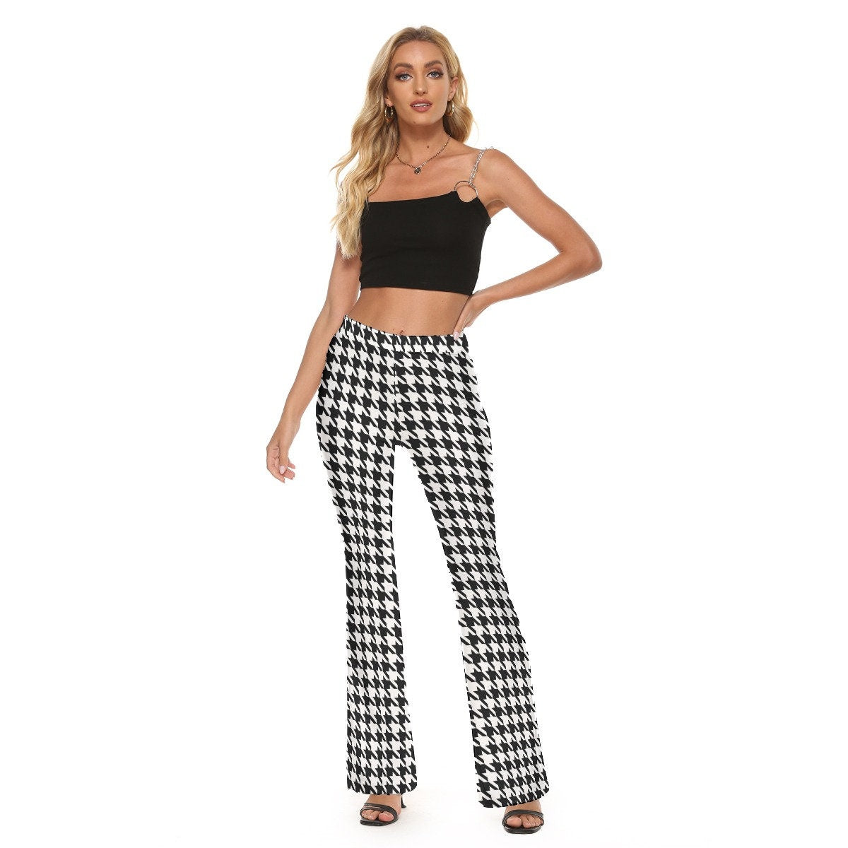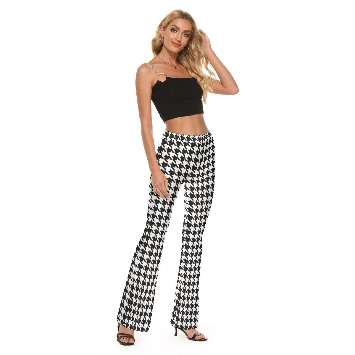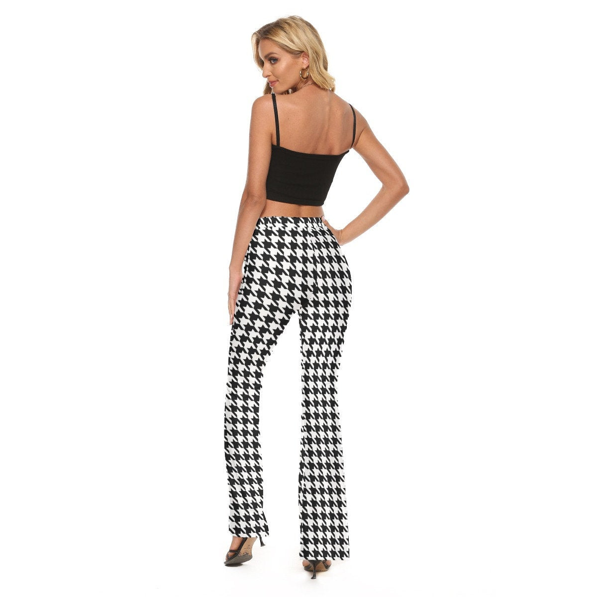 A classic houndstooth flare pants I designed. Wide waist band. Hip Flare bottom pants style. Fun for everyday wear. Perfect with platform heels, ankle boots, anything goes. Super retro! :)