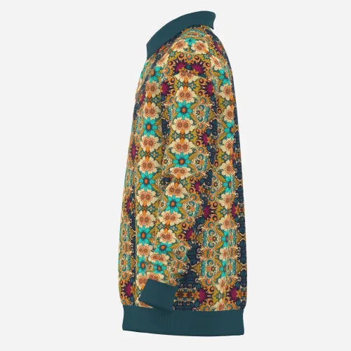 - Premium Retro Design Sophisticated 70s-inspired knit polo featuring vibrant floral pattern. Luxurious blend of teal, olive green, maroon, orange, beige and turquoise tones. Classic straight collar with button placket creates refined vintage appeal.