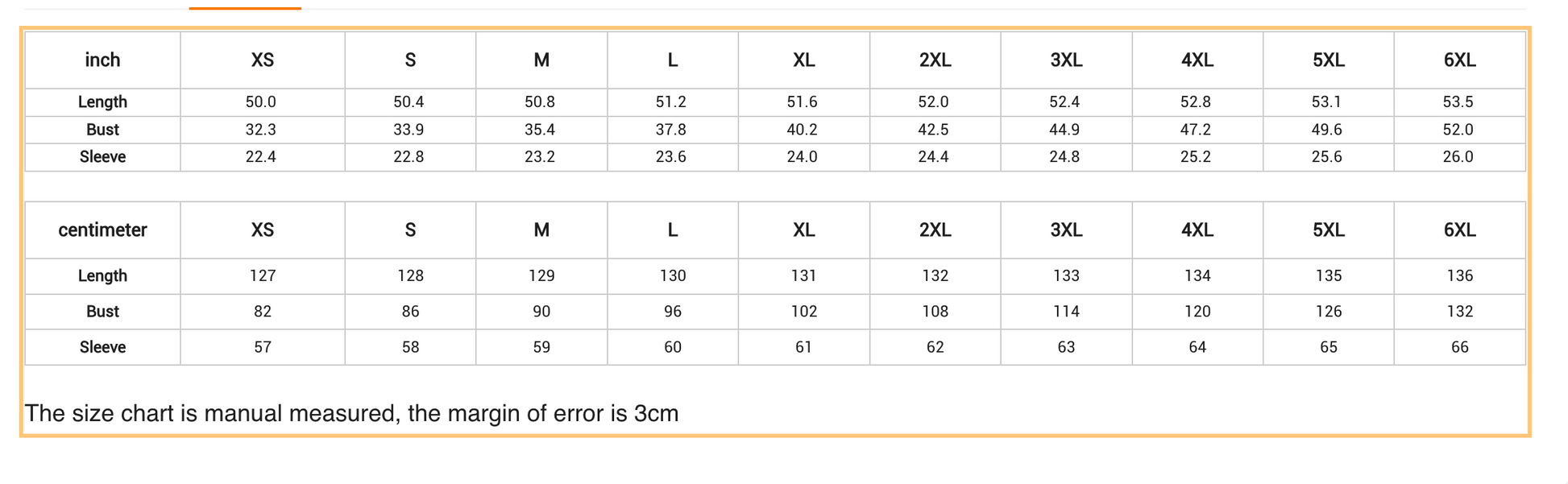 The size chart is manual measured, the margin of error is 3cm