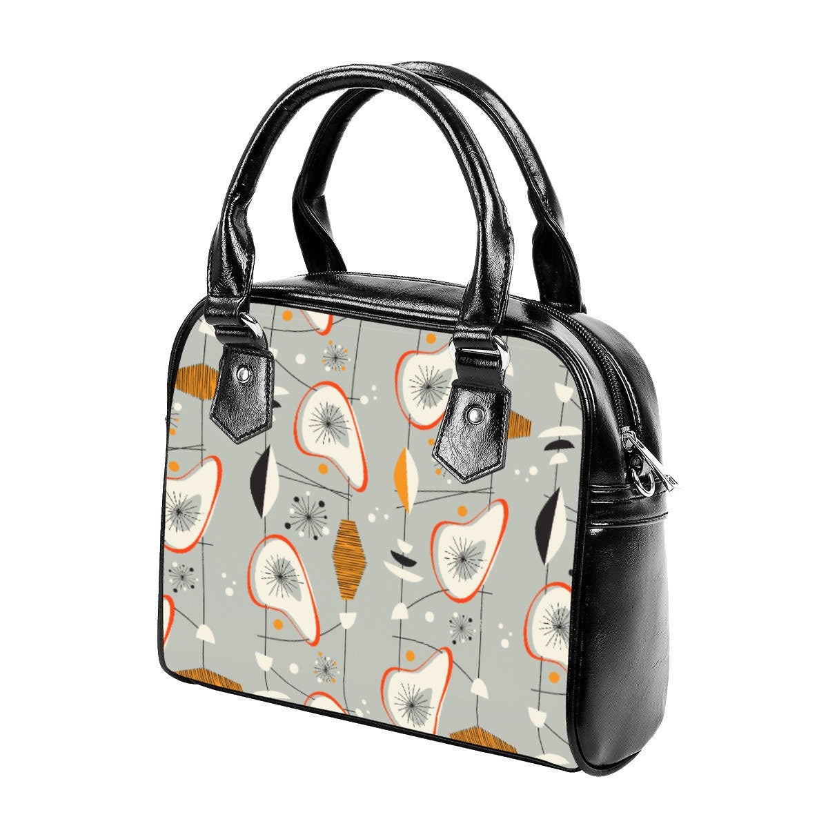 A mid century atomic gray orange geometric and star burst pattern print handbag design I created. A very unique retro style you won't find anywhere. It features a single zippered top closure as well as a removable, adjustable fabric shoulder strap. Great for everyday wear, the office or any fun retro inspired dress/outfit on any special occasion!